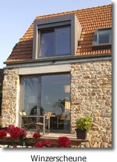 Kurpfalzstr. 102Ξ Gesamtkonzept Umbau WinzerscheuneDas Winzerhaus-Ensemble wurde ursprünglich als Wohn- und Betriebsgebäude einer bäuerlichen Familie genutzt. Es sollte zukünftig als Wohn- und Ferienwohnungshaus genutzt werden. Dabei wurde Wert darauf gelegt, den Charme des Anwesens über die alten Sandsteinmauern beizubehalten. Die Gliederung wurde in verschiedene Bereiche eingeteilt: Ξ WinzerscheuneDie Scheune bzw. das Gesindehaus wurde zur eigenen Nutzung mit genügend Rückzugsmöglichkeiten in Hof und Garten umgebaut. Die Scheune sollte mit modernen Stilelementen (Stahl, Glas) eine Verbindung mit den jahrhundertealten Sandsteinmauern erhalten. Die Wohnräume wurden offen und ohne Wände gestaltet. Die einzelnen Wohnbereiche werden lediglich durch die verschiedenen Ebenen abgeteilt. Eine optische Vergrößerung wurde durch große, lichtdurchflutete Öffnungen des Mauerwerks erreicht. Der Küchenbereich wurde mit einer auf Küchenboden-Niveau befindlichen Terrasse versehen. So entstanden auf zwei Ebenen mit jeweils zwei Ausgängen zu Garten und Innenhof. Der Küchenboden wurde mit sogenannten Schloßdielen ausgelegt. Die Terrasse wurde an der Stirnseite zum Garten hin mit einer Sandsteinmauer versehen, um den Charakter des Sandsteingebäudes zu erhalten. Der alte, gemauerte Gewölbeabgang am Rand des Küchenbereichs wurde erhalten und dient als Gestaltungselement. Der Gewölbekeller hat keinen direkten Zugang in den Wohnbereich. Eine Öffnung im Küchenbereich verbindet jedoch optisch den Wohnraum mit dem Gewölbekeller. Diese Öffnung wurde mit einer begehbaren Glasplatte versehen. Der Gewölbekeller soll nach seiner Trocknungsphase mit einer Stahltreppe versehen werden und als Wein- und Probierkeller genutzt werden. Die Treppe mit einer einfachen, offenen Stahl-Holzkonstruktion gewährleistet den Zugang zum oberen Stockwerk. Durch diese Bauweise wurde so wenig Licht wie möglich von beiden Ebenen genommen. Das obere Stockwerk wurde mit größtmöglichen Dachgauben versehen. Das Stockwerk ist somit schön mit Tageslicht durchflutet. Das Büro mit Blick auf die Rheinebene und den Haardtrand bietet optimale Arbeitsbedingungen. Das Büro ist bewusst einfach mit großen Ablageflächen versehen. Die Wandschränke ermöglichen die Lagerung von Gegenständen und Kleidung für den täglichen Bedarf. Lediglich der Schlafraum und das Bad wurden durch Türen abgetrennt. |